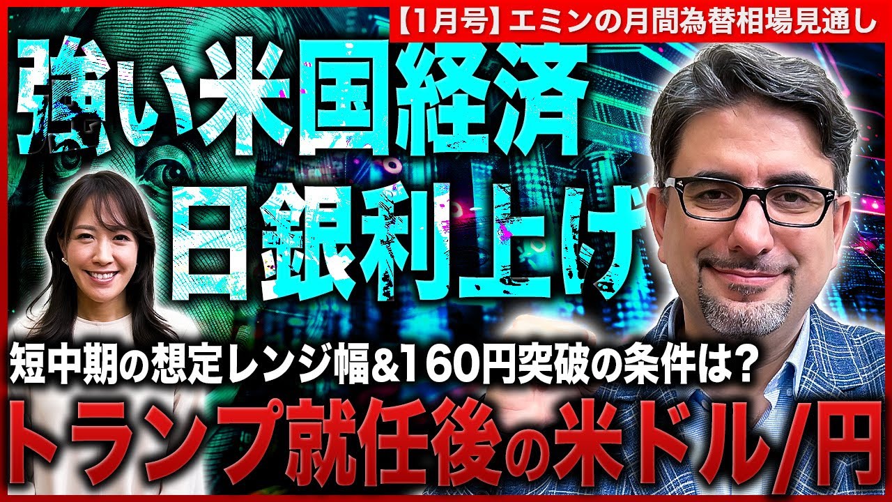 エミンの月間為替相場見通し2025年1月号!天才エコノミストのエミン・ユルマズ氏が、堤友香さんと米ドル/円について解説します。エミンさんの今後の見通しに注目です。