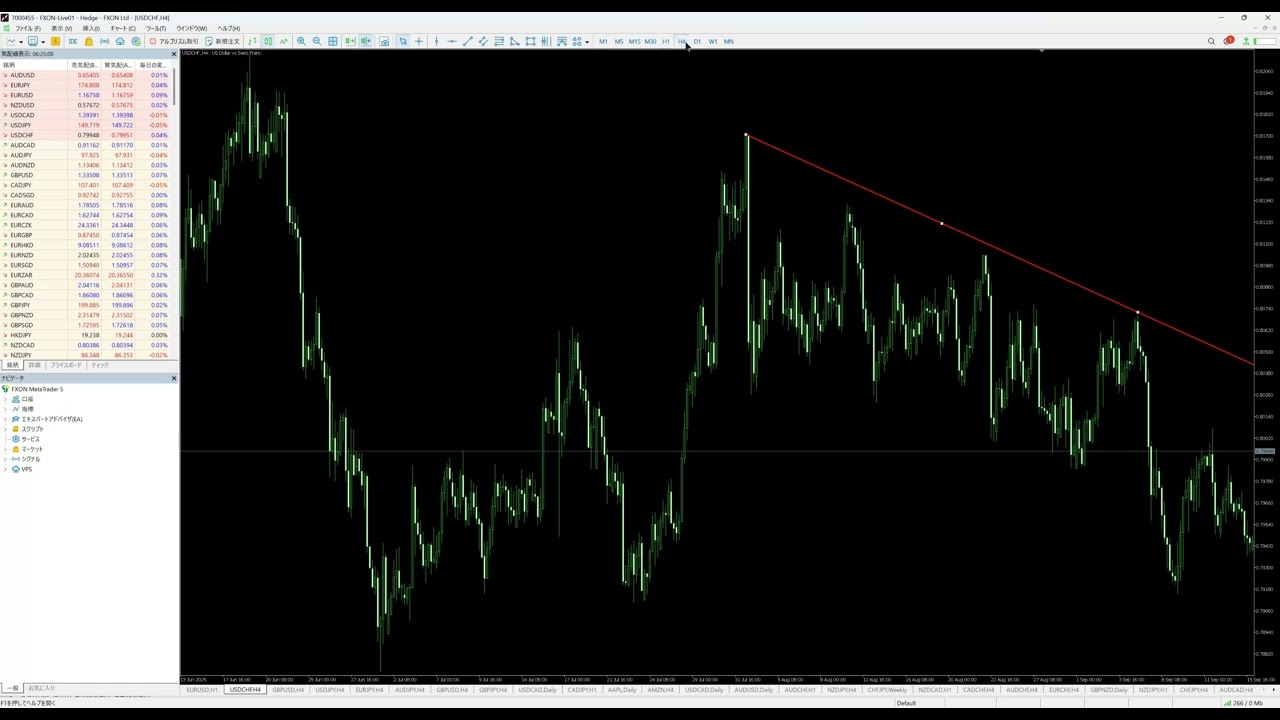 本動画はUSD/CHF(ドル/スイスフラン)4時間足のテクニカル相場分析です。
