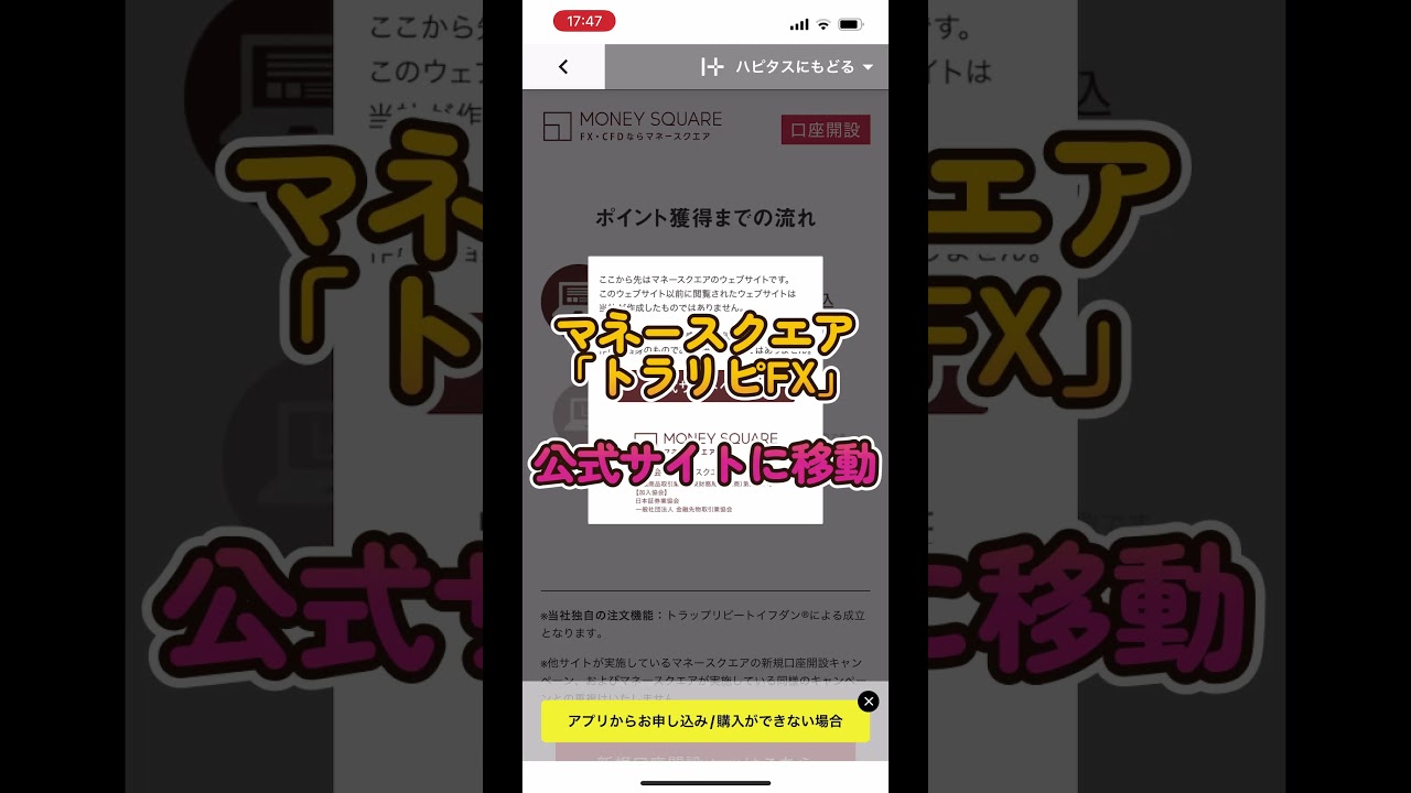 マネースクエア「トラリピFX」の口座開設をハピタス経由で申し込んでポイントを獲得する手順を解説。