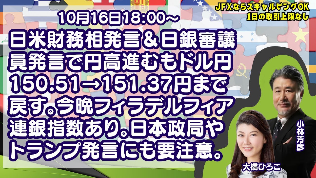 【LIVE放送】10/16 18:00~ 日米財務相発言&日銀審議員発言で円高進むもドル円151.37円まで戻す。今晩フィラデルフィア連銀指数あり。本日は大橋ひろこ氏と詳しく解説いたします。