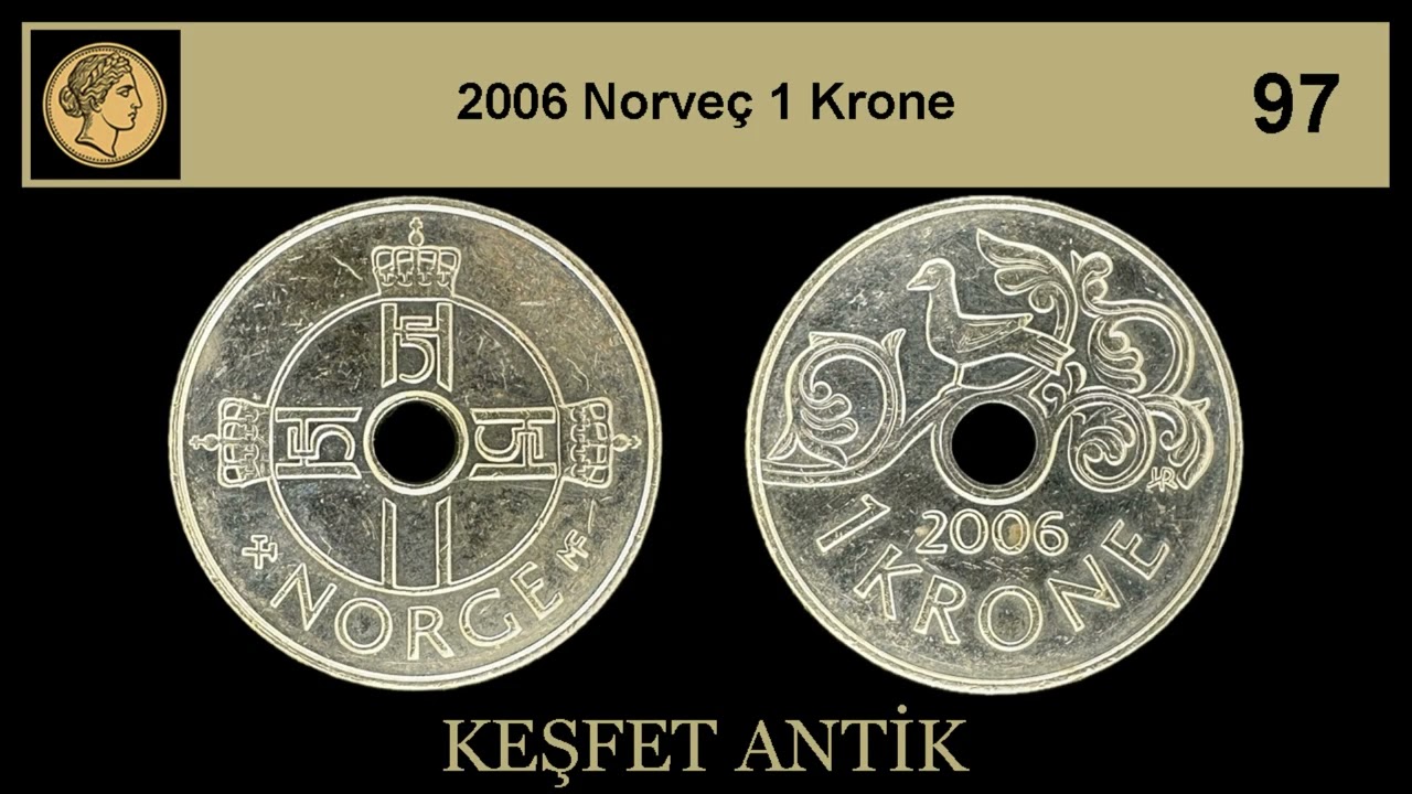 2006 Norveç 1 Krone madeni para, bakır-nikel alaşımından üretilmiş olup ülkenin karakteristik delikli tasarımına sahiptir. Ön yüzünde Kral Harald V’in monogramı ve “NORGE” yazısı bulunurken, arka yüzünde kuş motifleri ve “1 KRONE” ibaresi yer alır. Tasarım, Ingrid Austlid Rise’a aittir.