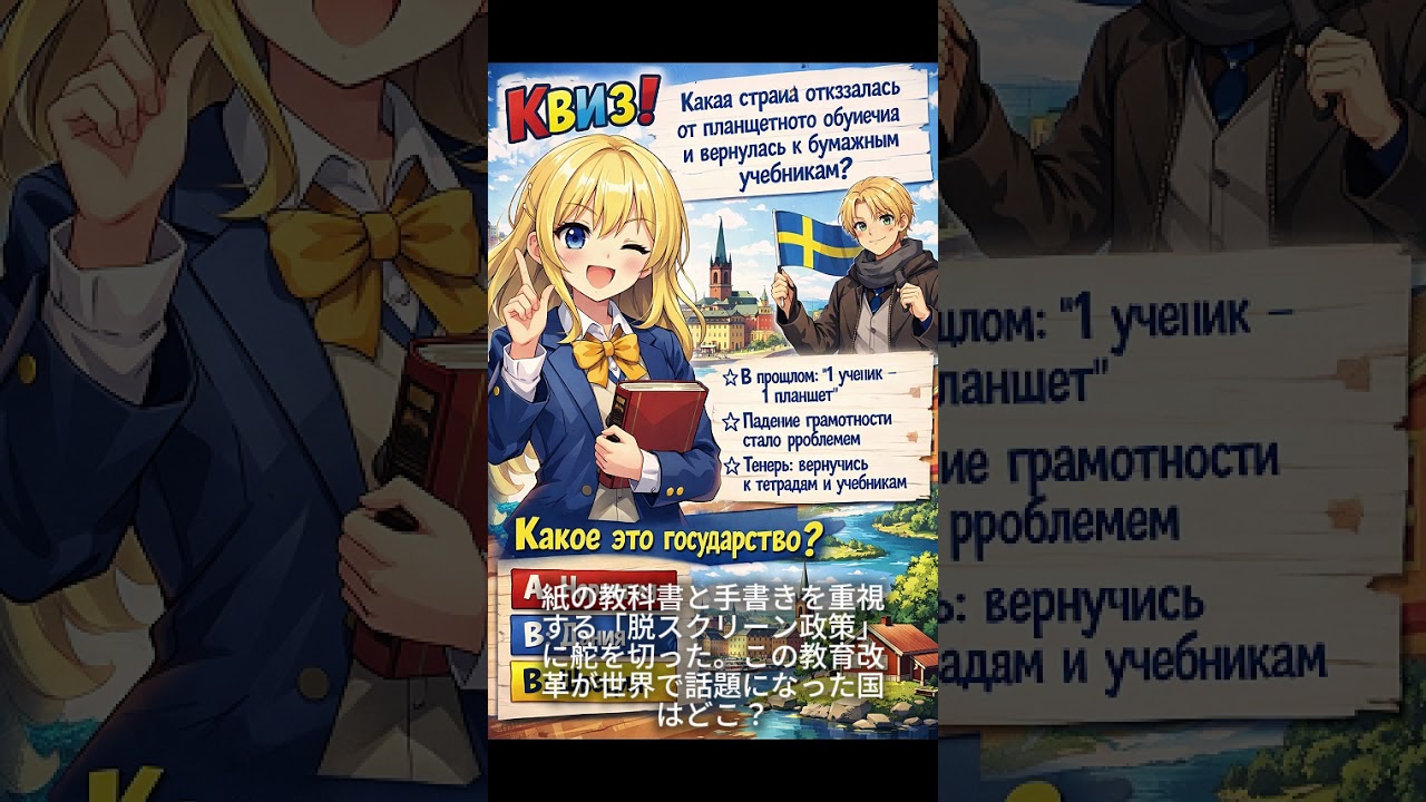 かつては「1人1台」のタブレットを誇り、教科書を減らしてデジタル教育を推し進めた北欧の国。ところが読解力や集中力の低下が問題視され、政府は方針を転換。幼児のデジタル学習を見直し、紙の教科書と手書きを重視する「脱スクリーン政策」に舵を切った。この教育改革が世界で話題になった国はどこ?